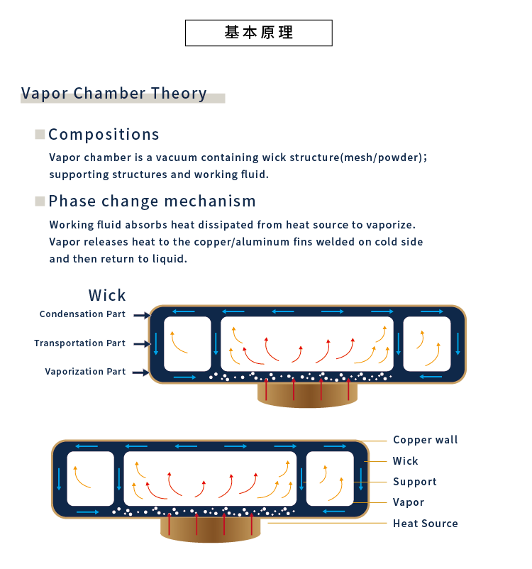 VC熱導板的基本工作原理與熱導管(Heat Pipe)完全相同,都是利用工作流體在密閉真空腔體內的兩相變化(蒸發和冷凝)來進行高效熱傳輸。
